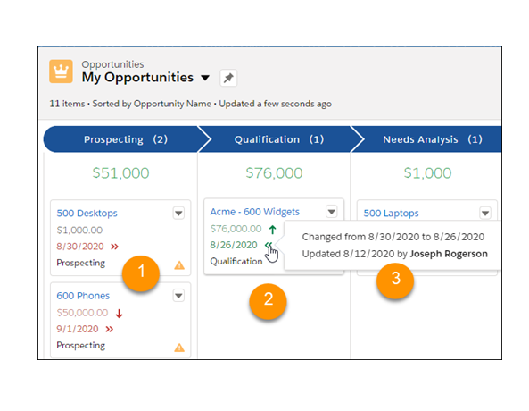 This Winter ’21 release enables opportunity highlights to change so your sales reps can prioritize a deal by following recent changes to closing dates and amounts. Arrows and text colors indicate changes in closing dates and amounts in the Kanban and the opportunities list for the last 7 days.