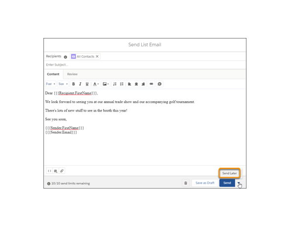 - For scheduling a list email, select Send Later.