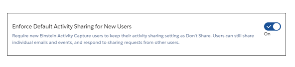 This new feature allows the Einstein Activity to be captured by default sharing setting to Don’t Share. The users can now prevent new Einstein Activity Capture users from changing it. This way, enforcing the sharing setting keeps the user’s sensitive information safe.