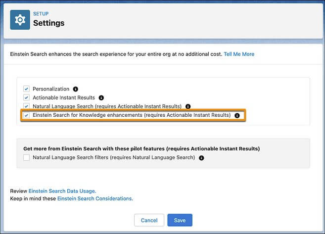 How: Enter Einstein Search in the Quick Find box in Setup's setup menu, then choose Settings. Save your changes after activating the Einstein Search for Knowledge enhancements.
