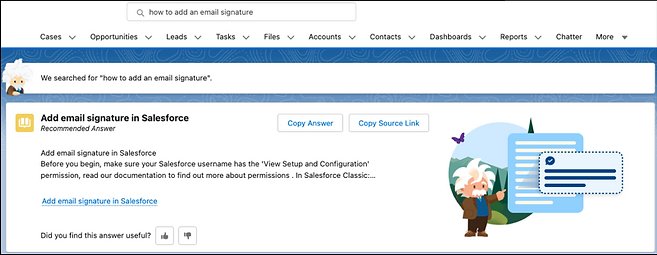 When your agents use Einstein Search Answers to glean the most pertinent details from a knowledge article, they can act right away. The returned answers are only three lines long so that customer service representatives can copy the response and its internal link to their clipboard before sharing it without leaving the page. Agents used to open the record page and copy the URL, and section of an editorial.