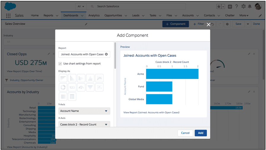 With a joined report as its source report, a dashboard component can contain data from multiple standards or custom report types. Or, you can provide multiple views of the same object using the Salesforce Winter ’19 features.