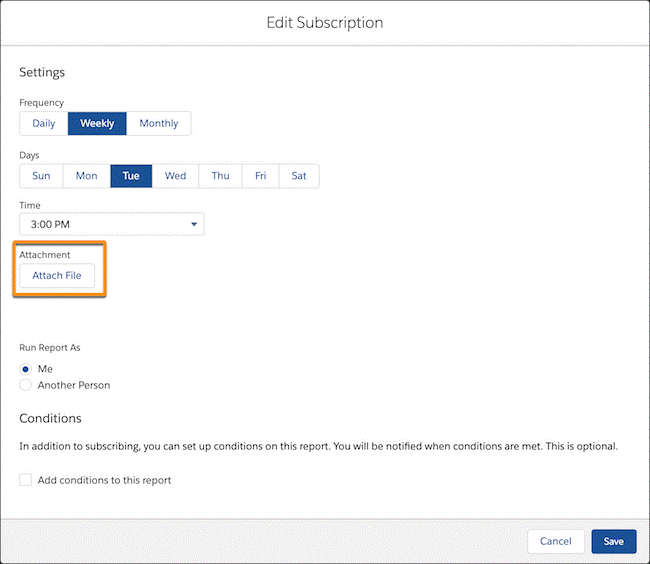 The email includes the report’s name in the subject line. Row-level details of the records are available in the attached .csv file. Also, there are small changes to the Edit Subscription menu design to include an Attach File button with a refined layout.