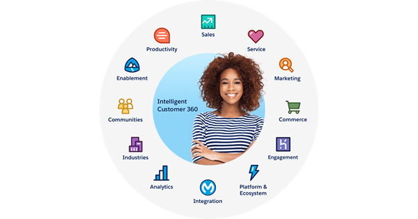 - Customer 360 exhibits customers’ data in a dynamic view, providing every crucial detail together from various domains like service, commerce, marketing, sales, and more.
