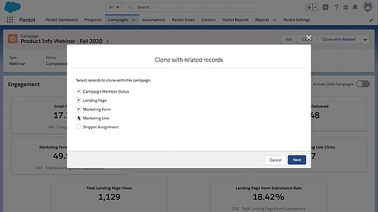 A new campaign cloning button has been added to save time and boost efficiency. You’ll now be able to clone a campaign and all the related marketing asset records in a matter of a few seconds with only a couple of clicks. With this new “clone with related” button, you can now clone landing pages, forms, form handlers, and links related to any campaign easily.