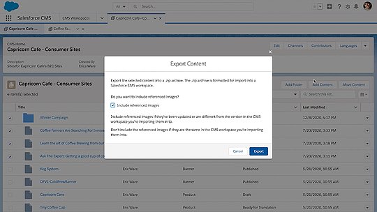 The latest Salesforce CMS enhancements have export functionality, along with a new content key. The enhancements allow copying content between the organization’s Salesforce instances, such as sandbox, and a production org that allows components, which uses the content to keep the references intact. Customers can export content from one org (a sandbox) and import it into another org (production) and keep CMS Lightning components working.