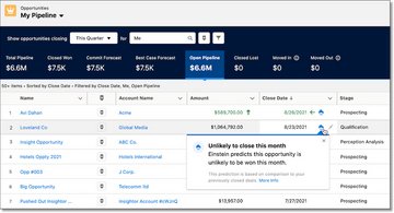 With Einstein Deal Insights, you can see which deals are unlikely to close in that particular month.