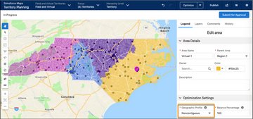 How: For example, you start with contiguous territories in North Carolina, but you want two noncontiguous territories for reps who sell remotely. So you select those territories and change their geographic profiles to Noncontiguous.