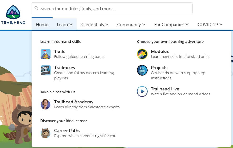 The content is organized in units, modules, trails, projects, and trailmixes that guide you through all the content you need to know about Salesforce.