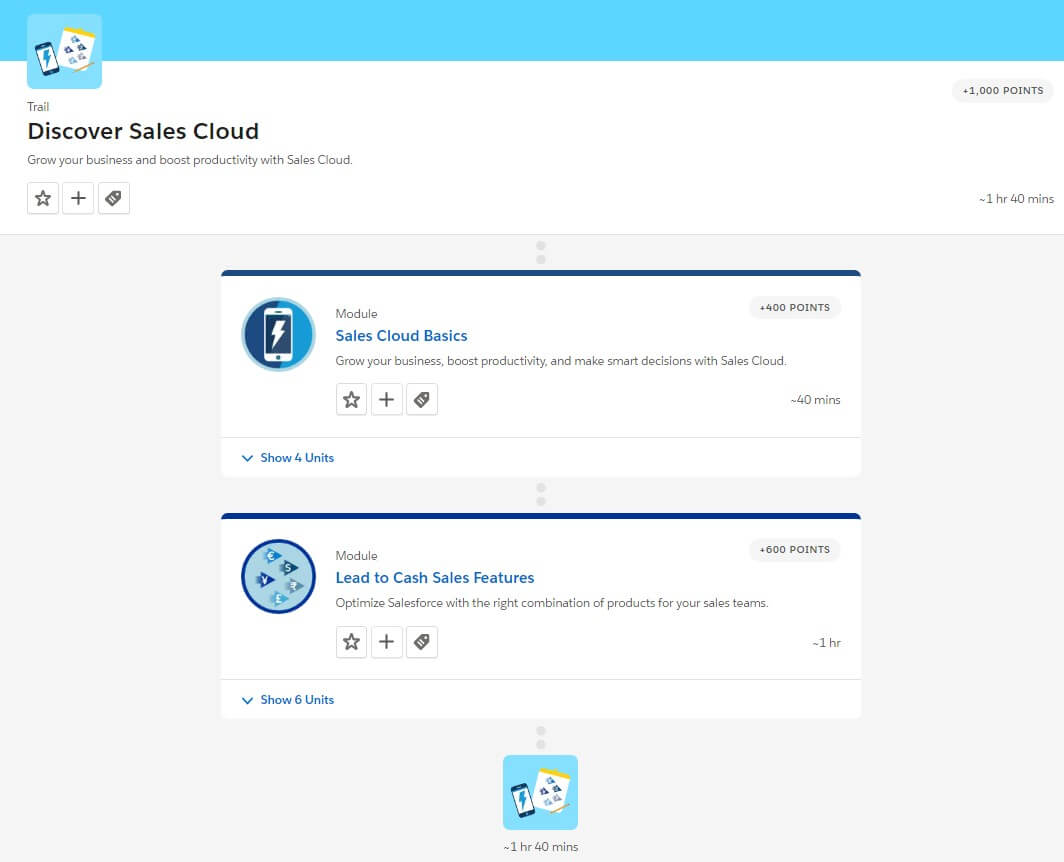 Units: allow the user to navigate through various Salesforce-related features, tools, or best practices learning objectives.