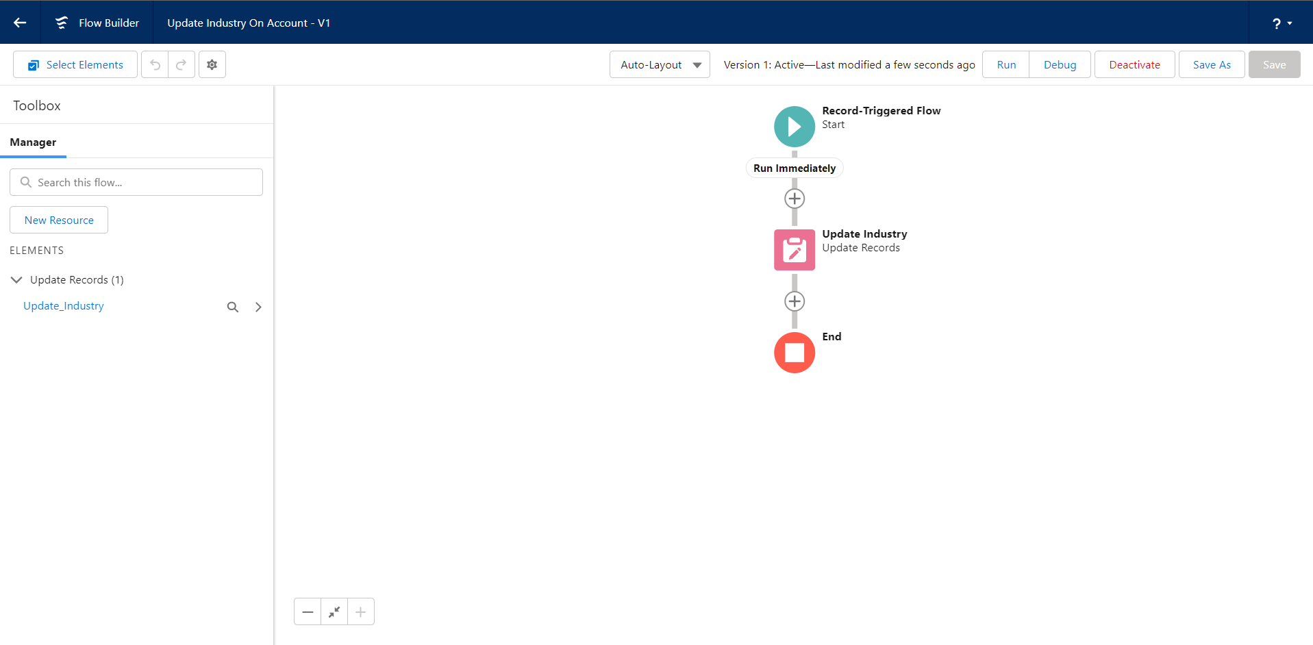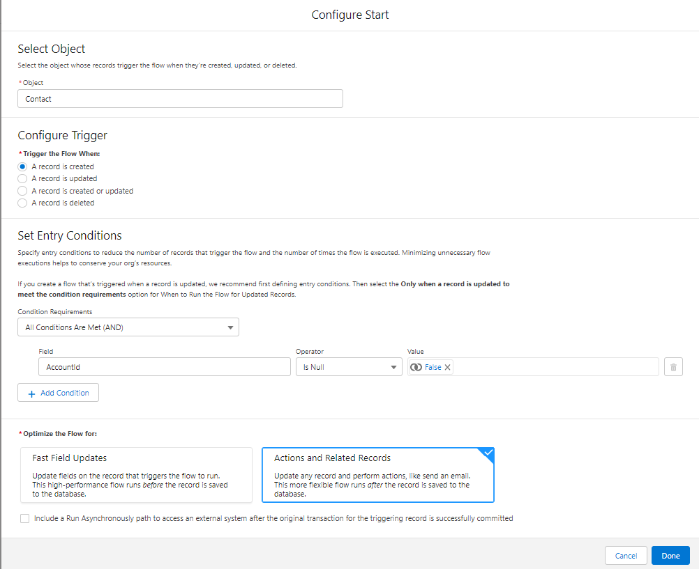 Step 3: Here I want to update ‘Industry Field on Account to Agriculture’ when a Contact is Created. So that I created one flow as -