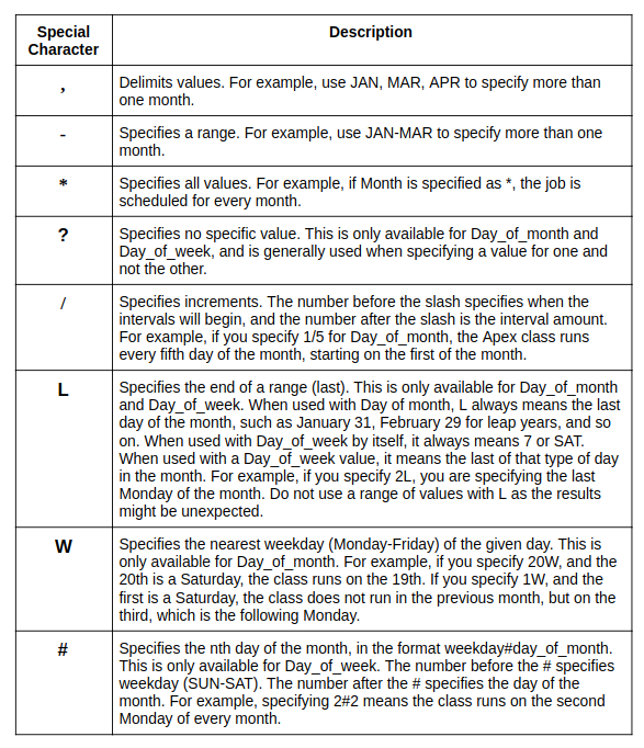 Hello to all the salesforce developers, here in this blog I am covering a very crucial topic that we all use in our coding skills - CRON expression. As we all know that Salesforce provides us with a very great feature of Scheduling an apex class. In a standard way through customization part, we can schedule an apex class with the frequency of weekly days or monthly dates with a preferred start time. But through CRON expression we can schedule an apex with our customized date time or occurrence through code. That’s an interesting feature that salesforce allows developers to customize according to their own need and scenario.