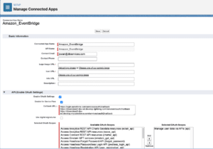 You can also create a Connection to your Salesforce org. You will need your org’s URL and the generated consumer secret to create this connection. There are a couple of steps that you will need to perform. First, you will need to create a Connected App in Salesforce. A connected app is a framework that allows external applications, like AWS, to communicate with Salesforce using APIs. Once you have created a Connected App, you can take the generated consumer key and consumer secret and use them in AWS to finalize the connection. This help article goes through the steps of creating a connected app to Amazon. Once that has been done, you create a connection using API destination and Event Rule in AWS. This AWS doc goes over the steps of creating those components in order to send data from AWS back to Salesforce.