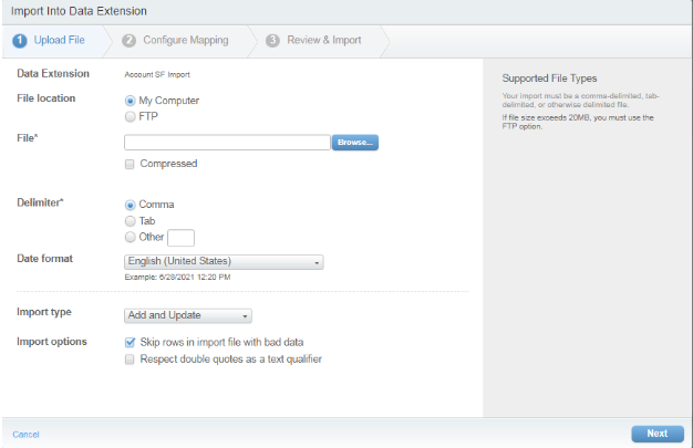 After creating the standard data extension we can directly import the data from a CSV file into the data extension.