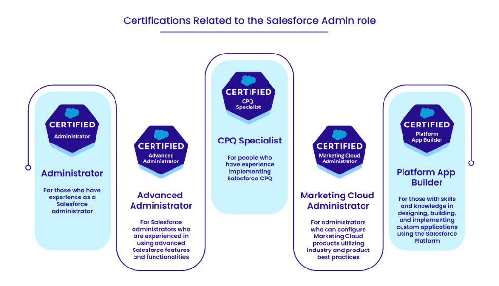 It takes a lot of perseverance and dedication on the part of these specialists to keep their knowledge and skills up to date. There are 5 certifications related to the Salesforce admin role.