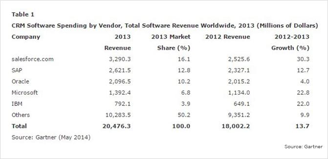 • Undoubtedly, Salesforce dominated the worldwide CRM market with a market share of 18.6%, and 28.2% revenue growth from 2013 to 2014.