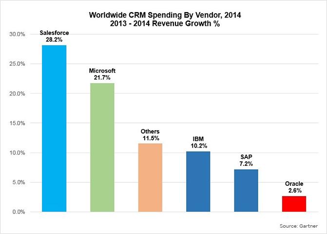 Comparision between CRM revenue growth rates by vendor for 2014 worldwide CRM sales