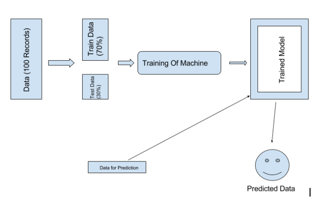 Explanation of above fig:Let’s assume we have 100 records. We are giving 70% of data to our machine as the Training data and rest of the 30% data as the test data.