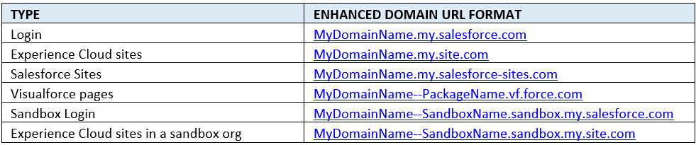 Enhanced domains are the latest version of My Domain that meets the latest browser requirements. With enhanced domains, all URLs across your org contain your company-specific My Domain name, including URLs for your Experience Cloud sites, Salesforce Sites, Visualforce pages, and content files.