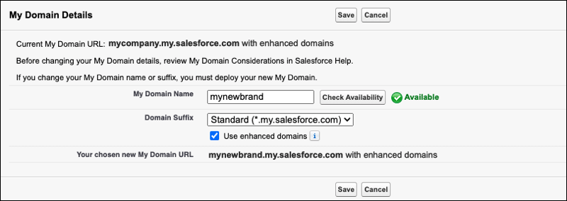 - If more suffixes are available for your org’s My Domain, a suffix dropdown list appears. Enhanced domains can only be enabled for the Standard suffix.
