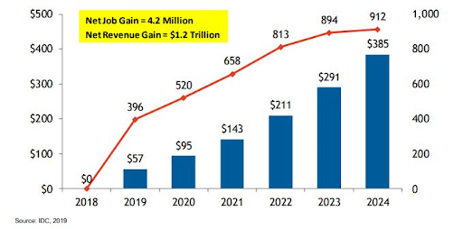 The business revenue generated from the use of Salesforce Cloud will add $1.2 trillion to the worldwide Salesforce economy between year-end 2018 and year-end 2024, according to the graph above. The IDC analysis also found that 4.2 million additional employment will be produced throughout this time span.